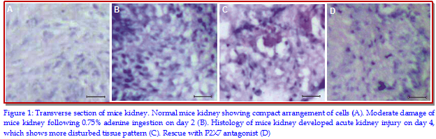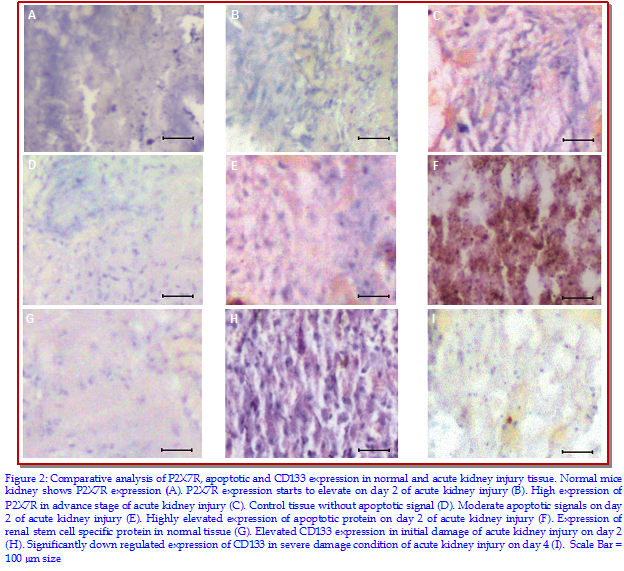 The role of the P2X7R in developing acute kidney injury is unknown. In this study, we developed acute kidney injury mouse model system using 0.75% adenine and examined for renal damage using histology on day 2 and day 4. P2X7 antagonist (A438079) was used to study the recovery process after initial damage and it shows positive histological data. The P2X7R expression on the day 2 and day 4 of acute kidney injury was studied using immunohisto-chemistry and Western blotting. Result shows elevated expression as acute kidney injury progress. Later the P2X7R expression was compared with apoptotic signal and stem cell specific marker (CD133). The results conclude that the apoptotic signals are mainly associated with advanced stage of acute kidney injury but not much in day 2. Similarly, CD133 expression was mask-ed in latter stages of injury following elevated expression in the initial stages.