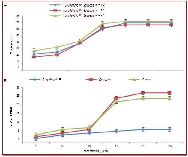 In the present study, the effect of cucurbitacin B and cerulenin combination on osteosarcoma was investigated to develop an effective treatment regimen. The IC50 values of cerulenin and cucurbitacin B combination in the proportion of 1:1, 1:2 and 2:1 were 3.5, 7.2 and 8.6 μg/mL, respectively. The combination index (CI) values of <0.95 for inhibition of growth and <0.93 for inhibition of SENP5 expression clearly indicated synergism between the two. The Q-value for combination of 1 μg/mL cerulenin and 1 μg/mL cucurbitacin B was 1.2. AI calculated for tumor tissues treated with a combination of cucurbitacin B and cerulenin (26.2 ± 8.4%) was higher than that of the tissues treated separately with cucurbitacin B (14.5 ± 6.8%) or cerulenin (12.6 ± 7.5%). The AI for untreated tumor tissues was 4.2 ± 1.5%. Thus, the combination of cucurbitacin B and cerulenin can be a promising regimen in the treatment of osteosarcoma.