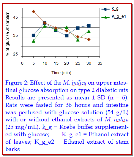 Mangifera indica Linn, locally known as mango tree has been claimed to possess antidiabetic properties by many investigators. The present study was undertaken to screen the hypoglycemic and antihyperglycemic activity of both ethanol and water extracts of leaves and stem-barks of M. indica in nondiabetic and diabetic model rats in different prandial state. The results showed that all of the extracts had significant antihyperglycemic effect in type 2 diabetic model rats when fed simultaneously with glucose load (p<0.05-0.01; p<0.005-0.001). Moreover, the ethanol extract of stem-barks showed significant antihyperglycemic effect when the extract was fed 30 min prior to the glucose load (p<0.01). Investigations were carried out to evaluate the effect of M. indica on glucose absorption using a rat intestinal preparation in situ. The ethanol extracts of stem-barks reduced glucose absorption gradually during the whole perfusion period in type 2 diabetic rats.