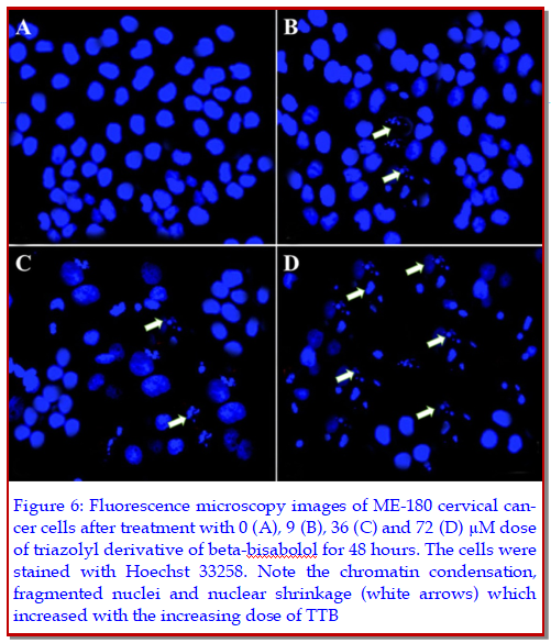 The aim of the current investigation was to design, synthesize and demonstrate the anticancer and apoptotic activity of trifluoromethyl-phenyl-triazolyl derivative of beta-bisabolol (TTB) in ME-180 human cervical cancer cells. MTT and clonogenic assays were used to evaluate the cell viability and colony formation tendencies of the cells respectively. Phase contrast and fluorescence microscopic investigations were used to evaluate the effect of TTB on cellular morphology and apoptosis. Flow cytometric analysis using fluorescent CM-DCFH2-DA were used to study the effect of TTB on reactive oxygen species (ROS) formation. The results revealed that TTB significantly inhibited the proliferation of ME-180 human cervical cancer cells in a time-dependent as well as dose-dependent manner. TTB has the capacity to inhibit both anchorage dependent as well as anchorage independent growth of ME-180 cervical cancer cells. TTB-treated cells revealed chromatin condensation, fragmented nuclei and nuclear shrinkage. A 3-fold increase of ROS production was seen after 72 ?M TTB treatment.