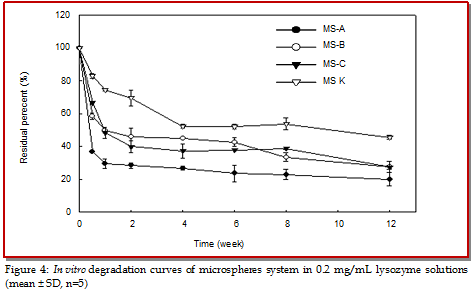 To evaluate the degradation behavior of theophylline/chitosan/β-cyclodextrin microspheres, we performed both in vitro study by putting the microspheres in phosphate buffered saline or in phosphate buffer saline with enzyme and in vivo study by implanting the microspheres into the back of male Sprague-Dawley rats. The results showed that microspheres were degraded in enzymatic hydrolysis and phosphate buffer saline, which were degraded faster in 0.2 mg/mL lysozyme than in phosphate buffer saline. The morphology of microspheres in phosphate buffer saline and enzyme solution developed rough surfaces, and showed irregular shape and pores after 8 weeks. The microspheres were degraded in vivo within 8 weeks with irregular, sheet, porous morphology, and the diameters were smaller than 5 ?m. These results indicated that the theophylline/chitosan/β-cyclodextrin microspheres had a good degradation both in vitro and in vivo which can be used as a pulmonary drug delivery carrier.