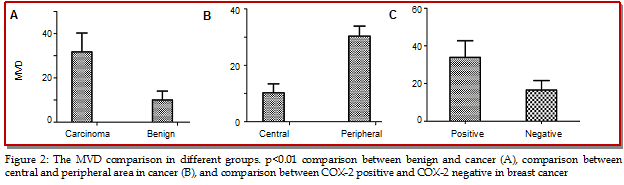 COX-2 expression by means of immunohistochemistry in 120 cases breast invasive ductal carcinomas and 60 cases benign lesions were compared with clinicopathological features and prognostic molecular markers. COX-2 role of invasiveness and chemotaxis in breast cancer cell line MDA-MB-231 by using small RNA interference (siRNA) plasmids to disrupt COX-2 expression in vitro were investigated. The results show that COX-2 immune positivity and percentage of positive cells in breast carcinomas were higher than those in benign lesions and positivity correlated significantly with HIF-1?, VEGF, the grading, metastasis and vascular invasion of carcinoma (p<0.05). This study suggests that COX-2 overexpression correlates with poor clinicopathological parameters in breast cancers, and the reduction of COX-2 expression can obviously inhibit the invasion and chemotaxis of cancer cell line MDA-MB-231 using RNA interference. The findings of the present study suggest that COX-2 overexpression in breast cancer may be considered as a negative prognostic marker.