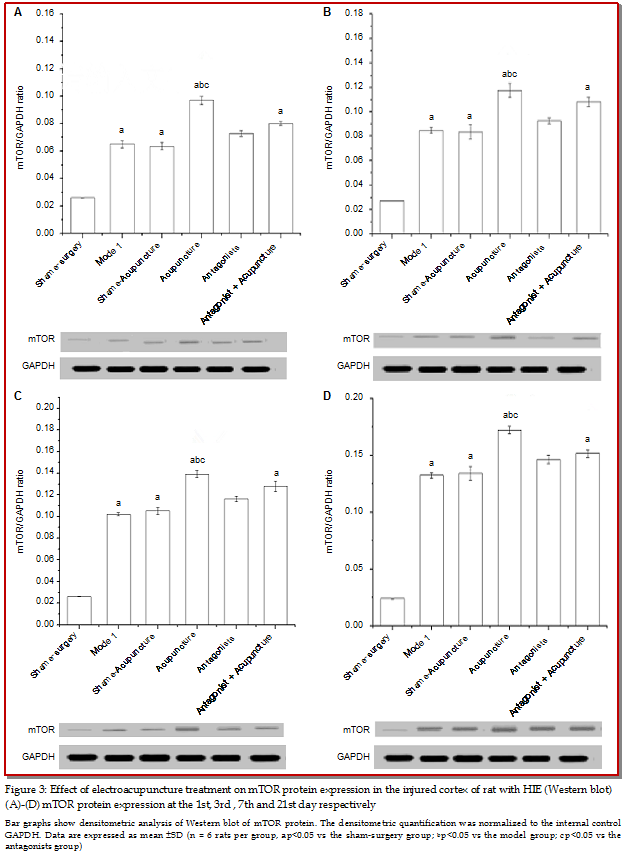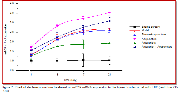 In this study, we observed the therapeutic effects of acupuncture and investigated the underlying molecular mechanisms by constructed a hypoxic-ischemic encephalopathy (HIE) animal model. In the electroacupuncture group, mTOR expression increased since 1d, and continued to rise till the 21st day. All of the differences were significantly (p<0.05 vs the model group). Meanwhile, mTOR expression was analyzed by Western blotting. There was statistical significance between the model group and the electroacupuncture group in the four time periods (p<0.05). The results provide evidence that electroacupuncture treatment protected cortical neurons against HIE-induced neuronal damage and degenerative changes in rats, which is in association with activation of mTOR both at the mRNA level and protein level. Therefore, electroacupuncture may become a potential therapeutic strategy for HIE of newborn.
