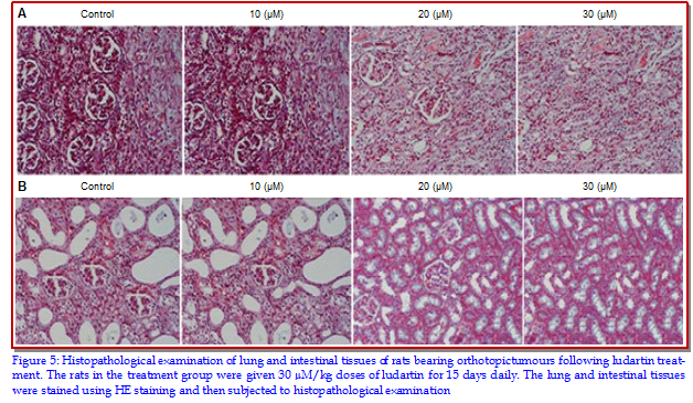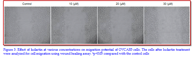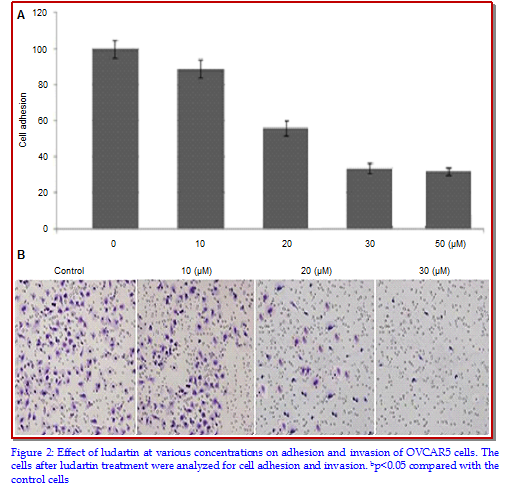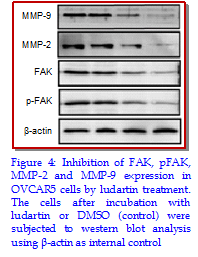 In the present study, the effect of ludartin on OVCAR5 ovarian carcinoma cells was investigated. MTT cell assay was used for the analysis of cell viability and wound healing assay for migration potential. Results revealed that ludartin treatment at 10 and 30 µM doses reduced the cell viability from 94 to 38%. The invasive potential was decreased from 62 to 24% with increase in ludartin concentration from 10 to 30 µM. Western blot analysis showed that ludartin treatment reduced the expression of p-FAK in OVCAR5 cells significantly. Ludartin treatment for 48 hours also caused a significant decrease in the expression of MMP-2 and MMP-9 in OVCAR5 cells at a concentration of 30 µM. The metastatic regions were absent in the rats treated with 30 µM/kg doses of ludartin daily for 15 days. Thus, ludartin treatment inhibits the proliferation, invasion and migration of ovarian cancer cells through down-regulation of pFAK and MMPs, therefore can be used for the treatment of ovarian cancer.