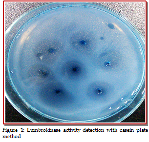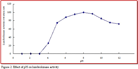 The purpose of this study was to separate lumbrokinase in Pheretima praepinguis and examine its enzymatic properties. With P. praepinguis as material, lumbrokinase was separated with the salting out method. Lumbrokinase activity was measured with casein medium plate method. Effect of pH and temperature on lumbrokinase activity was studied. Results of lumbrokinase separated from P. praepinguis was relatively high. Lumbrokinase activity in neutral or slightly alkaline environment was higher. Lumbrokinase had tolerance ability to high temperature, with highly enzymatic activity under 60°C and wide range of temperature adaptation.