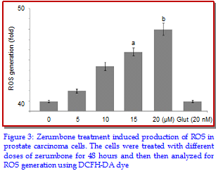 The aim of the present study was to investigate the role of zerumbone on the proliferation, cell cycle arrest and cell death in DU-145 prostate cancer cell lines. The MTT assay revealed that zerumbone (20 µM) reduced proliferation of DU-145 cells to 39.0% at 48 hours. It also increased the proportion of propidium iodide stained cells to 53.4% compared 1.0% in control. However, the population of annexin V-stained cells remained uneffected indicating induction of non-apoptotic cell death by zerumbone. Treatment of DU-145 cells with zerumbone (20 µM) caused 8-fold enhancement in the level of reactive oxygen species (ROS). On the other hand, exposure of the zerumbone treated DU-145 cells to glutathione inhibited the generation of ROS. Fow cytometry using propidium iodide staining revealed that zerumbone treat-ment increased proportion of cells in G1 phase to 71.3% on compared to 34.7% in the control. The results from Western blot analysis revealed a significant increase in the expression of cyclin D1 protein in DU-145 cells on treatment with 20 µM concentration of zerumbone. Thus, zerumbone treatment inhibits prostate cancer cell viability and can be used for its treatment.