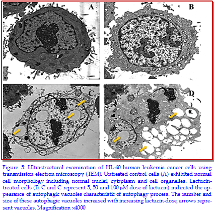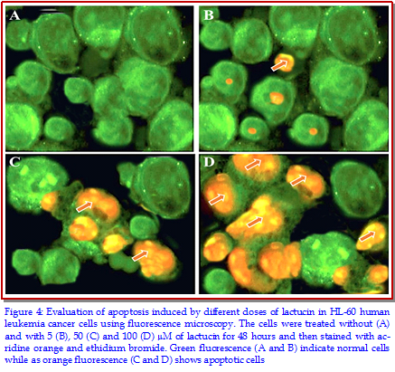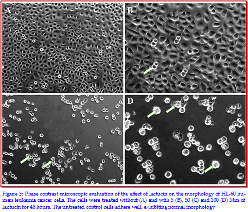 The main purpose of the present study was to examine the antitumor and apoptotic effects of lactucin in HL-60 human leukemia cancer cells. MTT assay was used to examine the cytotoxic effects of lactucin while as phase contrast, fluorescence and transmission electron microscopy techniques were used to evaluate the apoptotic effects of lactucin in these cells. Flow cytometry was used to assess the effects of lactucin on cell cycle phase distribution. The results indicate that lactucin induced potent, time and dose-dependent antitumor effects. The microscopic techniques showed that lactucin induced characteristic features of apoptosis including cell shrinkage, membrane blebbing, appearance of vacuoles, swelling of mitochondria and endoplasmic reticulum. Viable cells are stained green, early apoptotic cells are stained yellow, while as late apoptotic cells are stained reddish orange. Flow cytometry revealed that lactucin induced sub-G1 cell cycle arrest.