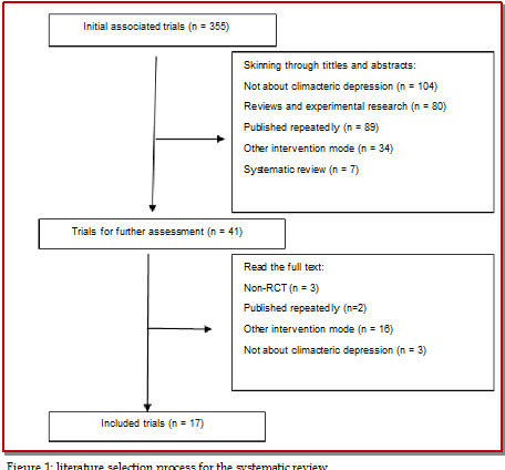 The aim of this study was to assess the clinical efficacy and safety of acupuncture for climacteric depression. Two reviewers searched major databases independently. The quality assessment and data analysis were evaluated by Cochrane reviews 5.3.0. Seventeen clinical trials were included, contained 1,369 cases. Meta-analysis of acupuncture comparing with medicine showed that: a) Affective rate: [OR = 1.44, 95% CI (1.02, 2.04)], the difference had statistically significance; b) HAMA score : [MD = -2.12, 95% CI (-2.85, -1.40)], the difference had statistically significance; c) HAMD score: The difference of the 2nd week, 4th week, 6th week, 8th week, or 12th week was not statistically significant; d) Kupperman score: [MD = -5.05, 95% CI (-11.94, 1.84)] showed no statistical significance; e) Incidence of adverse events of acupuncture (2.7%) was significantly less than the control group (20%). In conclusion acupuncture will help to improve depressive symptoms of climacteric and decrease adverse reactions.