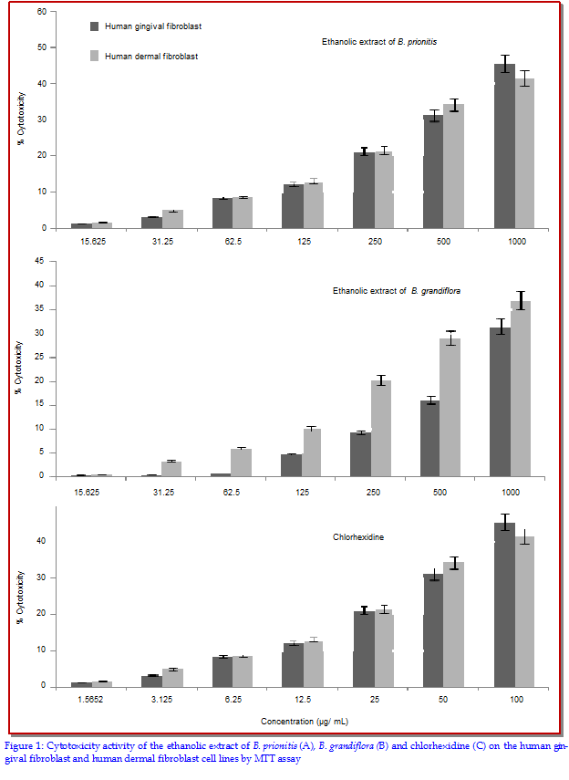 Leaf juices as well as leaves of Barleria prionitis and Barleria grandiflora are being used by rural people across various regions of India in the treatment of oral ailments such as dental troubles, gum ailments, pyorrhoea, dental carries and mouth ulcers. Zone of inhibition and MIC values obtained for all the extracts suggest ethanolic extract of the herbs were more antimicrobial when compared to the aqueous extract. Results of biofilm suppression were found statistically significant (p<0.05) when compared to control. Cytotoxicity was evaluated by MTT assay on human gingival fibroblast and human dermal fibroblast cell lines for ethanolic extract of the herbs. CTC50 value was found to be more than 1,000 µg/mL for ethanolic extracts of both herbs. Chlorhexidine was found to be more cytotoxic with CTC50 value of 12.525 µg/mL. Ethanolic extract of B. prionitis and B. grandiflora found significantly cytotoxic (p<0.05) in comparison with control.