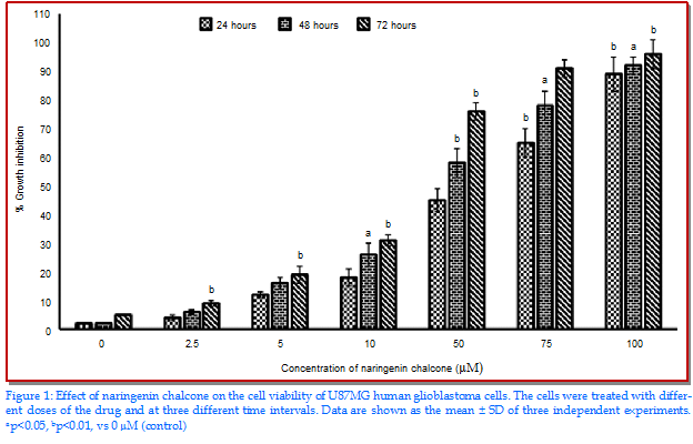 The aim of the current study was to investigate the in vitro and in vivo anti-tumor effects of naringenin chalcone in U87MG human glioblastoma cells and in xenograft mice model. The effect of naringenin chalcone on apoptosis induction was assessed by fluorescence microscopy using acridine orange/ethidium bromide and Hoechst 33342. Effect of the compound on PI3K/Akt signalling proteins was assessed by Western blot assay. Naringenin chalcone induced dose-dependent as well as time-dependent cytotoxic effects in these cells. Transmission electron microscopy showed that naringenin chalcone induced the formation of autophagic vacuoles. The number and size of these autophagic vacuoles increased with increasing dose of naringenin chalcone. It also led to the activation of both phosphorylated as well as non-phosphorylated PI3K and Akt proteins. In vivo results showed that both tumor volume and tumor weight were lesser in naringenin chalcone-treated groups with its different doses than in vehicle control group.