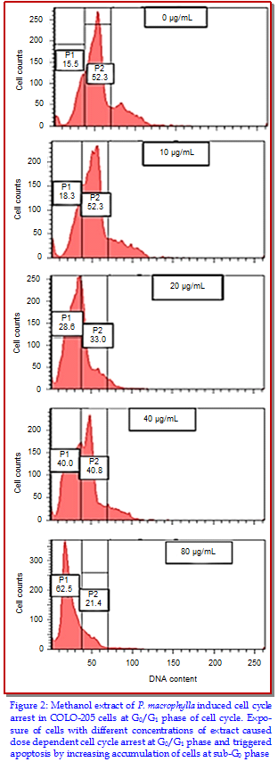 The primary objective of the current work was to investigate the antitumor potential of Primula macrophylla extracts in human colon cancer cell line (Colo-205) along with evaluating the effects on apoptosis induction, cell cycle arrest and mitochondrial membrane potential. Cell viability was assessed by tetrazolium-based MTT assay. Flow cytometry measurement was carried out to assess the effect of the extract on cell cycle phase distribution and mitochondrial transmembrane potential. Results showed that P. macrophylla methanol extract was effective and exhibited highest cell growth inhibition (IC50 value, 26.17 ?g/mL). Methanol extract significantly increased the side-scattering profile of Colo-205 cells in concentration-dependent pattern. Exposure of Colo-205 cells with different concentrations of the methanol extract (0-80 ?g/mL) caused dose-dependent G0/G1 cell cycle arrest along with inducing apoptotic cascade by increasing the population of cells at G0/G1 phase. Furthermore, methanol extract treatment caused an increase in mitochondrial membrane depolarization in Colo-205 cells.