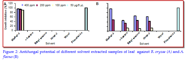 The different parts of Physalis philadelphica were evaluated for the antifungal, anti-oxidant and HPLC assay. The methanol extract of leaf showed inhibitory activity against Pencillium digitatum (58% ZI), Aspergillus flavus (95% ZI) and Rhizopus oryzae (96% ZI) at a concentration of 400 ppm. Strong anti-oxidant activities were found in different parts of the plant. The effects of different extraction solvents on the anti-oxidant activity and antifungal activity of the medicinal extracts were observed. The methanol extract from the leaf, stem, fruit and water fractions from the calyx exhibited strong anti-oxidant activity of 94, 89, 88 and 93% respectively. The ethyl acetate extract was found as a best solvent for the recovery of gallic acid in HPLC assay. No correlation was observed between the gallic acid and anti-oxidant capacity of the extracts.