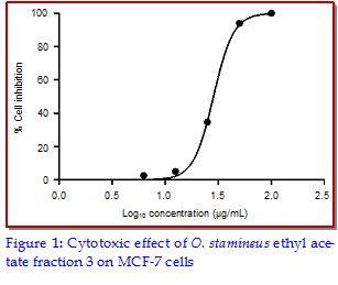 The aim of the present study was to analyze the anti-cancer effect of Orthosiphon stamineus leaf extract on MCF-7 cells. Ethyl acetate extract of the plant was eluted and pooled into 6 fractions based on their Rf values and the fractions were tested for cytotoxicity. Fraction 3 was found effective (IC50 = 28.5 µL/mL) and was subjected to LC-MS analysis which indicated the presence of biochanin, eleutherol and cinnamic acid. Further, cytotoxic effect of the fraction was confirmed in terms of nucleolin, bcl2, bax and cytochrome c expression in MCF-7 cells through RT-PCR where a marked decrease in nucleolin, bcl2 and increase in bax and cytochrome c were observed. The presence of eleutherol, a well-known anti-oxidant and anti-cancer agent, has been reported for the first time in O. stamineus. The anti-cancer activity of O. stamineus may be due to the presence of elutherol and cinnamic acid.