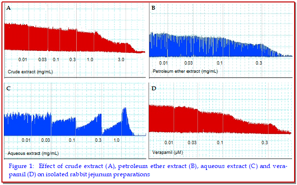 The current study was conducted to screen the possible pharmacological activity of Cnicus arvensis on the gastrointestinal system. The methanolic extract exerted concentration-dependent (0.01–3.0 mg/mL) spasmolytic effect using isolated tissue preparations of rabbit jejunum and caused relaxation of K+(80 mM)-induced spastic contractions. There was non-parallel shift in Ca++ concentration response curves towards right at tissue bath concentrations of 0.3 and 1.0 mg/mL. The solvent-solvents fractionation revealed domination of spasmolytic effects in petroleum ether fraction as compared to aqueous fraction. The methanolic extract also found to reduce the retching in chicks at 150 mg/kg as compared to chlorpromazine. The methanolic crude extract also found to reduce the number of wet spots using castor oil-induced diarrhea in rat as compare to loperamide. Our results reflected the presence of Ca++ channel blocking activity in methanolic extract, thus rationalizing the medicinal use of C. arvensis in diarrhea and vomiting.