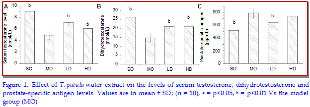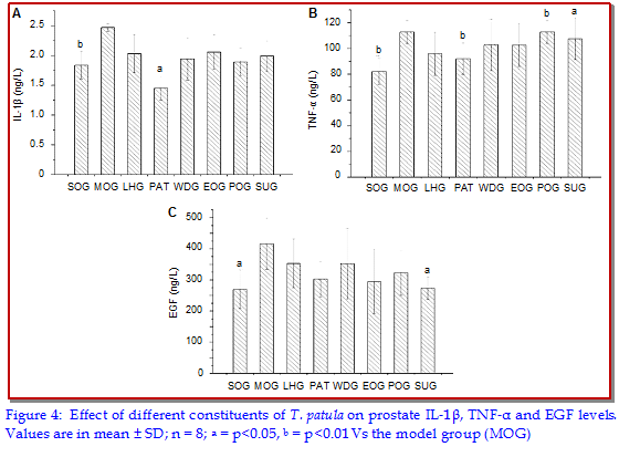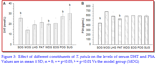 The effectiveness of water decoction of Tagetes patula was studied against the chronic nonbacterial prostatitis in a rat model induced by estradiol subcuta-neously in a castrated male rat. The low-dose decoction of T. patula significantly ameliorated the prostatitis. The low-dose of polysaccharide and supernatant constituent of T. patula decreased the levels of IL-1?, TNF-?, PSA, and EGF, and improved the levels of testosterone and dihydrotestosterone in vivo. Further, the chemical study indicated that flavonoids were predominant in the supernatant constituent of T. patula. The flavonoids and polysaccha-rides were the effective constituents against prostatitis and this effect may be mediated by keeping hormone balance and a down-regulation of the in?ammatory mediator level of the prostate.
