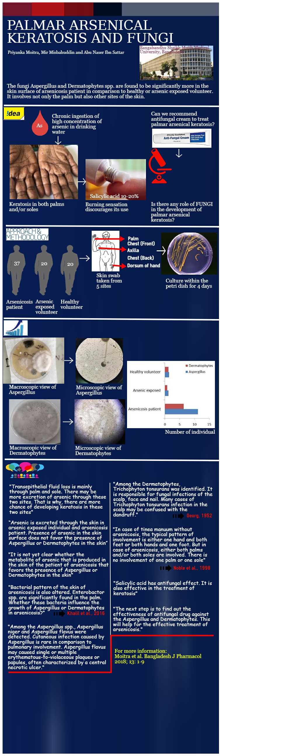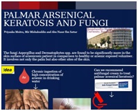 The aim of this study was to examine the pattern of fungi in palmar arsenical keratosis. The skin swab was taken from the five different sites (palm, dorsum, axilla, front and back of the chest) of arsenicosis patients (n=37), arsenic exposed volunteers (n=20) and healthy volunteers (n=20) of an arsenic endemic area. Fungi were cultured in the Sabouraud dextrose agar media. The skin of the healthy volunteers contained only four species of fungi: Aspergillus, Dermatophytes, Mucor and Fusarium. The incidence of each fungus was low (0-4 out of 20 cases). The chronic exposure to arsenic did not alter the pattern of fungi. However, the patient of arsenicosis showed increased inci-dence of Aspergillus and Dermatophytes species and decreased incidence of Mucor species. The supplementation of iron and folic acid to the patient for 12 weeks reduced the incidence of Aspergillus (only in axilla), Dermatophytes (only in palm) and increased the incidence of Mucor (all the sites except palm). In conclusion, skin fungi are altered in arsenicosis irrespective of intake of high concentration of arsenic.