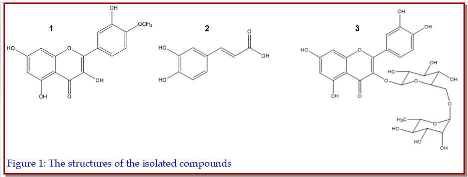 The aim of this study was to isolate the phytoconstituents and evaluate the biological activities of Berberis hispanica. Three phenolic compounds (tamarixetin, caffeic acid and rutin) were isolated from B. hispanica. The structures of the pure compounds were elucidated by spectroscopic and mass-spectrometric analyses, including 1D-, 2D-NMR, and HPLC-TOF/MS. In addition, antimicrobial, anti-oxidant and anti-proliferative effects of the extracts, some fractions and isolated compounds were evaluated. The extracts of B. hispanica were evaluated against six bacterial strains and exhibited the highest activity against Klebsiella pneumonia (15 mm at 100 mg/mL). Fraction T36 (IC50<5 μg/mL) from the n-butanol extract displayed higher radical scavenging activity than butylated hydroxytoluene. The isolated compounds were evaluated for their antiproliferative effects against human cervical adenocarcinoma (HeLa) cell line by real time cell analyzer assay and tamarixetin exhibited the remarkable effect (IC50<50 μg/mL) on HeLa cells. This study supports the documented medicinal effects of B. hispanica.