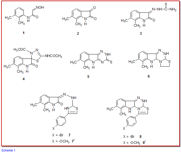Isatin derivatives are bioactive molecules. To study the cytotoxicity and eventually the anticancer activities against cancer cell lines, a series of dimethyl-substitituted isatin derivatives (4-8) starting from isatin thiosemicarbazones (3) had been synthesized in high yields. Investigation of the cytotoxicity of these compounds was carried out against brine shrimp by lethality bioassay. The present study shows that compounds 4, 5, 6 and 8/ with heterocyclic moiety had pronounced cytotoxicity whereas 7, 7/ and 8 were moderately active. It is remarkable that the substituent, X = -OCH3 has greater activity than the bromine atom in this series.