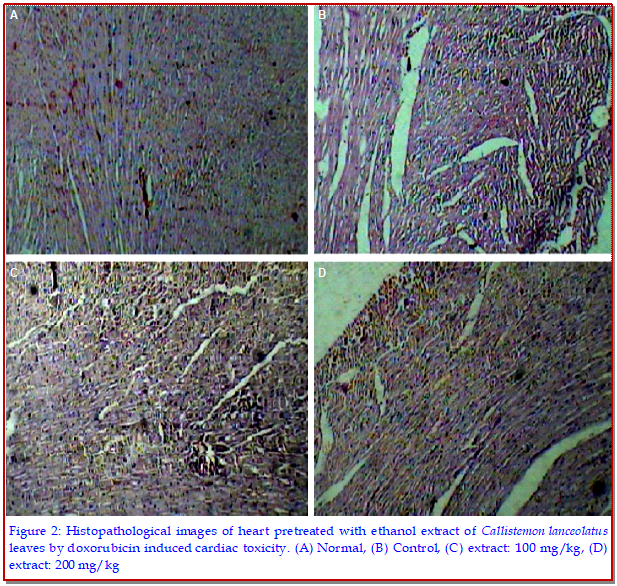 The cardioprotective effect of ethanol extract of Callistemon lanceolatus leaves (100 and 200 mg/kg) against doxorubicin-induced cardiomyopathy was studied. Rats were pretreated with the extract for 7 days and simultaneous treatment with doxorubicin along with the extracts for the next 14 days. After 24 hours of last dose of doxorubicin, ECG, invasive blood pressure, serum markers (creatine kinase-MB, lactate dehydrogenase, serum transaminases), tissue antioxidant markers (catalase, superoxide dismutase) and extent of lipid peroxidation (malondialdehyde) were studied. The elevated ST segment, decreased blood pressure, increased level of serum enzymes and decreased level of tissue antioxidant markers were observed in doxorubicin treatment (p<0.01). While 200 mg/kg extract significantly reduced the elevated levels of the serum enzymes and restores the ECG and blood pressure to normal, also significantly increased the tissue antioxidant levels, while decreased the malondialdehyde level (p<0.01) when compared with the control. The histopathological study confirmed the cardioprotection.