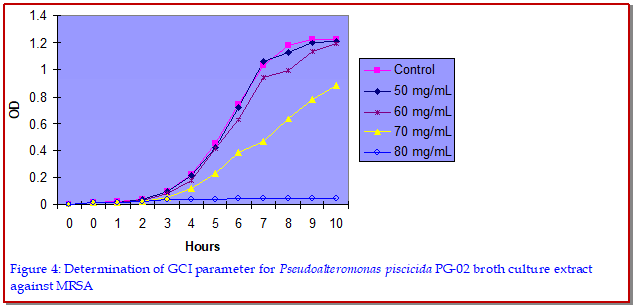 The aim of this study was to isolation of marine antibiotic-producing bacteria from the Persian Gulf, as an untapped source for searching new natural drugs. Bioactivity of ethyl acetate extract prepared from marine bacterial isolates was evaluated against 21 human pathogenic bacteria. GCI (Growth Curve Interference) parameter was determined for the obtained marine antibiotic compound against MRSA (Methicillin resistant Staphylococcus aureus). Finally, identification of intended isolate was done based on phenotipically and phylogenetically characters. Overall, 49 bacterial colonies were isolated but only one isolate from coastal sediment identified as Pseudoalteromonas piscicida PG-02 showed antibacterial activity. It was effective against all of tested bacteria except Listeria monocytogenes (clinical), L. monocytogenes (ATCC 19112), Proteus mirabilis (clinical) and Klebsiella pneumoniae (clinical). GCI parameter was obtained with concentration just near to MIC (GCI: 20 mg/mL). In conclusion, this marine bacterium can give hopes for treatment of diseases caused by multidrug resistant (MDR) bacteria.