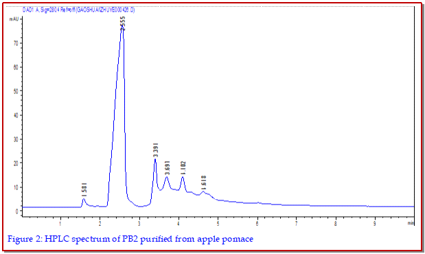 Dimeric procyanidin B2 (PB2) is one of phenolic compounds in apple pomace, an agro-industrial byproduct in apple juice processing. This work focused on purification of PB2 from apple pomace using sephadex column chromatography and its potential effect on lipopolysaccharide (LPS)-induced inflammation using RAW264.7 macrophages. PB2 with the purity of 72.28 ± 1.85% was successfully afforded using resin and gel column chromatographic technique. Anti-inflammatory tests suggested that the expression of cyclooxygenase-2 (COX-2) in LPS-induced murine RAW264.7 macrophages was suppressed in a PB2 concentration-dependent manner. PB2 at no less than 50 ?g·mL-1 could significantly suppress inflammation in the LPS-induced cells. Moreover, this suppressive effect was not correlated with PB2 pretreating. However, the COX-2 expression was not reduced in LPS pretreatment way followed by PB2 exposure, which suggested that PB2 has no repairing function. The results showed that high pure PB2 prepared from apple pomace has a remarkable anti-inflammatory property.