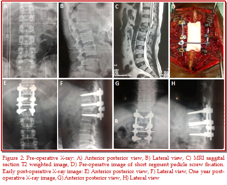 The aim of this study was to evaluate the efficacy of inclusion of the fractured vertebra in short segment fixation in terms of clinical and the radiological outcomes in unstable thoracolumbar junction burst fractures at a minimum of 1 year follow-up. Records of 52 patients (age: 21-50 years) with thoracolumbar burst fracture (T10L2) in Magerl Type A fractures underwent posterior pedicle screw fixation including the fractured vertebra. Clinical parameters were back pain using Visual Analogue Score (VAS) and disability using Oswestry disability index (ODI), neurological deficit (using ASIA grade) and radiologic parameters (Cobb angle, the kyphotic deformation and vertebral height) were measured before surgery and at 3, 6 and 12 months post-operatively. The presence of screw breakage, screw pullout, peri-implant loosening, and rod breakage were considered as criteria for implant failure. The majority of fractures resulted due to falls (31 cases), and the remaining cases resulted from car accidents (21 cases). The fractured vertebral body level was L1, T12, L2, T11, and T10 in 23, 17, 6, 4 and 2 cases and achieved satisfactory clinical outcomes according to the modified Mcnab criteria 18, 25, 6 and 3 cases were considered to have excellent, good, fair, and poor outcome. The mean kyphotic angle at pre-, post-operative and final follow-up was 13.5 ± 6.3, 13.4 ± 4.3, 8.5 ± 6. The average loss of kyphosis correction was 6.4 ± 5.2° at the final follow-up. The mean pre- and post-operative kyphotic deformation of vertebral body was 5.1 ± 3.2, 4.8 ± 2.3 and at final follow-up was 4.5 ± 4.0 (p>0.05). The mean anterior and posterior vertebral height also showed significant improvements post-operatively, which were maintained at the final follow-up. The mean ODI and VAS scores at the end of 1 year were 17.4%, 1.7 respectively. There was no case of major complication after surgery and during the follow-up period. In conclusion, reduction of unstable thoracolumbar junction burst fracture can be achieved and maintained with the use of short-segment pedicle screw fixation including the fractured vertebra, avoiding the need for anterior reconstruction.