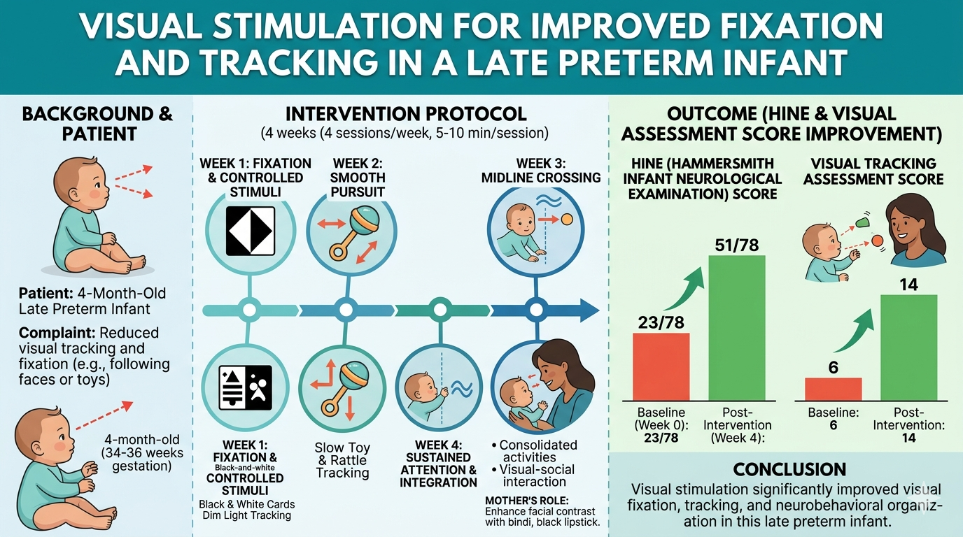 Case description and management: A 4-month-old child was brought by the parent with complaints of reduced visual tracking and fixation. Clinical findings met ICD-10 criteria for late preterm birth, a disorder related to neurological and sensory system immaturity. The infant received four sessions per week for 4 weeks, each lasting approximately 5–10 minutes. The intervention included black-and-white cards, toy or rattle tracking, dim light tracking, and high-contrast geometric patterns. Baseline assessment using the Hammersmith Infant Neurological Examination (HINE) and the Visual Tracking Assessment revealed reduced neurobehavioral organisation and poor visual tracking, with scores of 23/78 on HINE and 6 on the visual tracking assessment. Following four weeks of visual stimulation intervention, the scores improved to 51/78 on the HINE and 14 on the visual tracking assessment, indicating improved visual fixation, tracking, and neurobehavioral response.