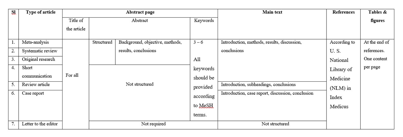 The following are the minimum requirements for manuscripts submitted for publication, which are based on updated recommendations for the conduct, reporting, editing, and publication of scholarly work in medical journals by the International Committee of Medical Journal Editors (ICMJE). Web site of ICMJE is www.icmje.org.