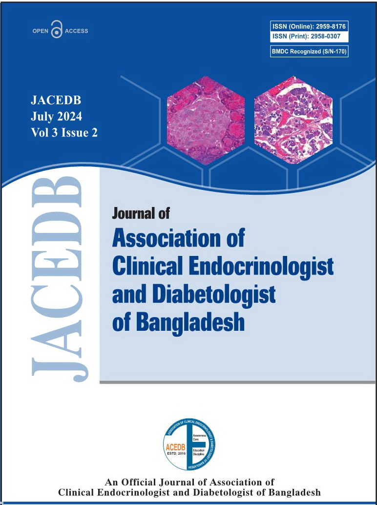 Articles in the Journal of Association of Clinical Endocrinologist and Diabetologist of Bangladesh (JACEDB) are licensed under a Creative Commons Attribution-NonCommercial 4.0 International License (CC BY-NC 4.0). This license permits Share— copy and redistribute the material in any medium or format, adapt — remix, transform, and build upon the material as long as it is not for commercial purposes.