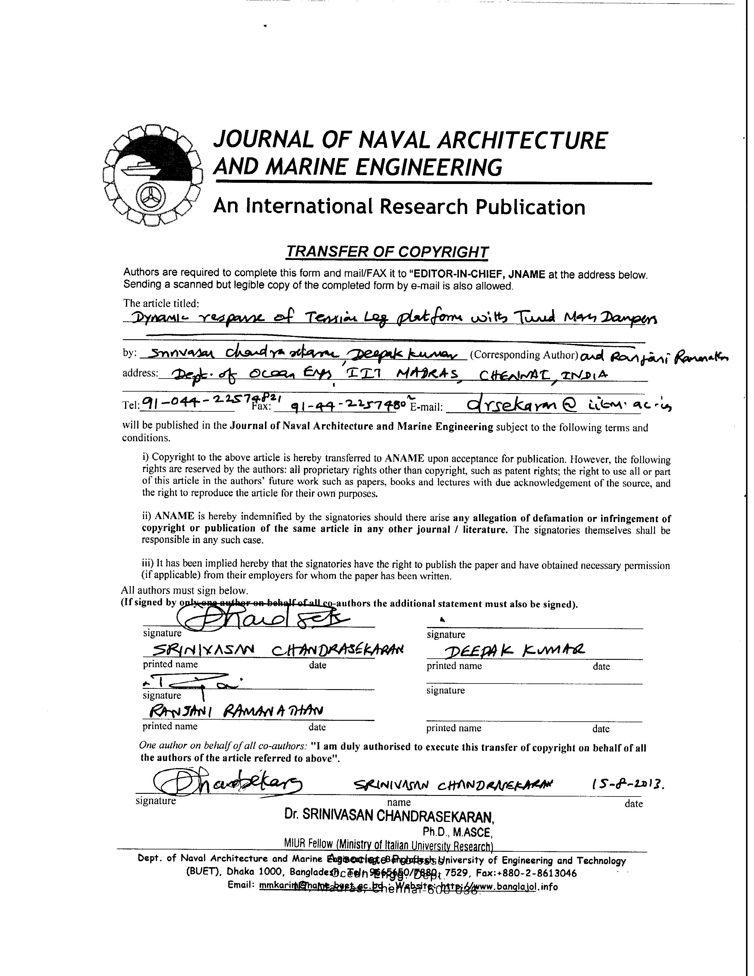 Chandrasekaran, S. Gaurav, Serino, G. and Miranda, S. (2011): Springing and ringing response of Triangular TLPs, International Shipbuilding Progress, Vol. 58 (2-3), pp. 141-163. doi: 10.3233/ISP-2011-0073.
